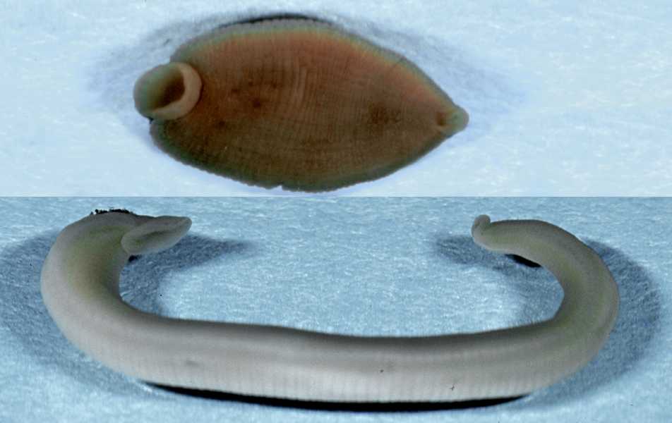 - Suckers on both ends, on the ventral or bottom side. Anterior sucker small or large, posterior sucker always large.