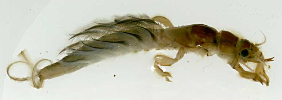 - 3 pairs of jointed legs, each with a single claw; 3 tail-like filament.